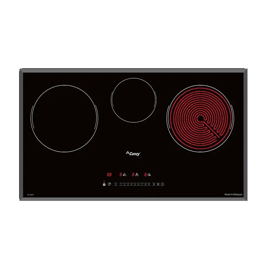 Bếp hồng ngoại điện từ Canzy CZ 86GP thiết kế 3 vùng nấu, trong đó 2 vùng nấu là từ có thể sử dụng các bộ nồi chảo inox từ, tiết kiệm điện và đun nấu nhanh hơn và 1 vùng nấu là hồng ngoại không kén nồi và có thể nướng trực tiếp trên bề mặt bếp.