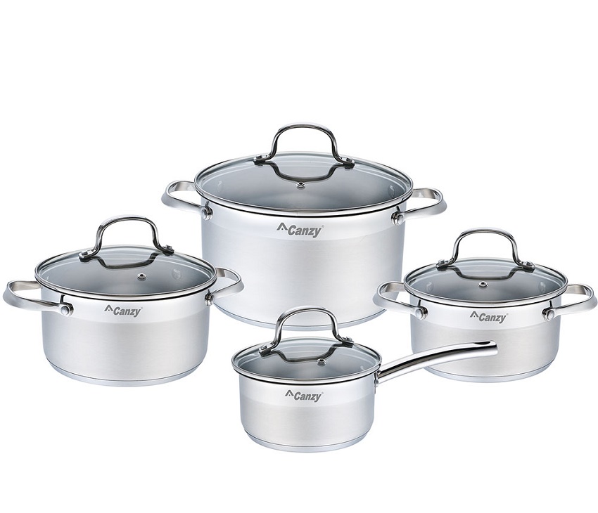 Bộ xoong nồi cao cấp Canzy 4 món được làm từ Inox 201 sáng bóng, không phản ứng với thức ăn và an toàn cho sức khỏe